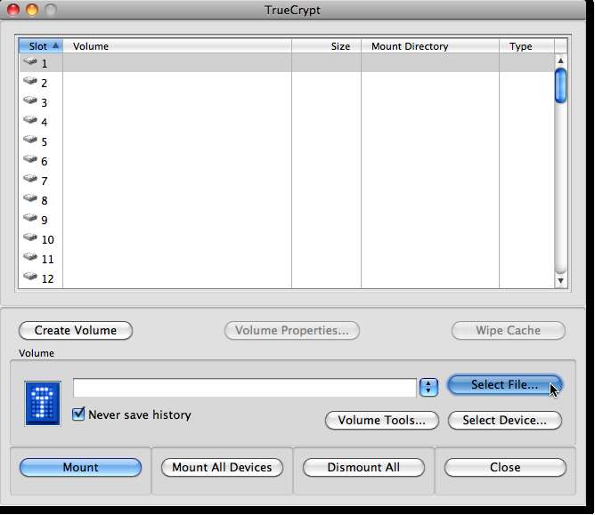 Sekarang kita perlu memasang volume baru kita sehingga kita dapat menambahkan file ke dalamnya. Klik Select File dan telusuri ke lokasi tempat Anda baru saja membuat container.