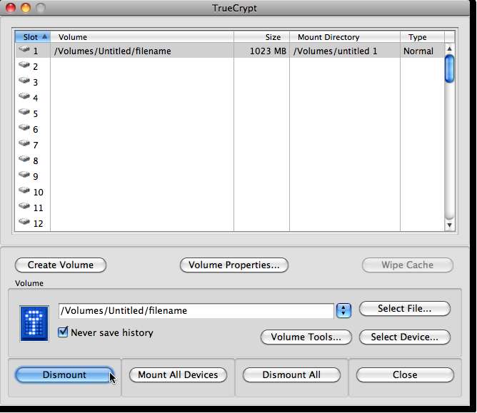 Setelah Anda puas dengan volume yang Anda miliki, kembali ke menu TrueCrypt dan klik Dismount untuk mengeluarkan volume dan mengenkripsi data Anda.