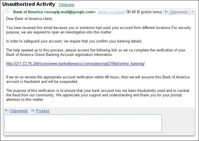 - Anda menerima email yang mengaku dari bank Anda, mengarahkan Anda ke situs web bank palsu dan meminta Anda untuk mengisi kata sandi Anda.