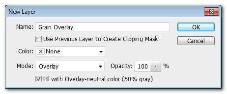 Membuat lapisan Grain Overlay: Langkah pertama adalah membuat lapisan biji-bijian kami. Pilih Layer -> New Layer -> Layer (atau CTRL + SHIFT + N) untuk membuat layer baru, beri nama "Grain Overlay", atur modenya ke "Overlay", dan centang kotak di bagian bawah berlabel "Fill with Overlay -warna netral (50% abu-abu), seperti: