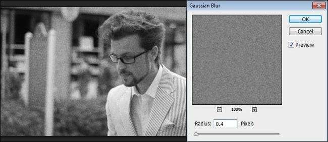 Pilih lapisan Grain Overlay jika belum dipilih. Dari menu filter pilih Filter -> Blur -> Gaussian Blue. Radius blur default adalah 1.0 yang terlalu banyak blur. Jatuhkan ke 0,1 dan gunakan tombol panah atas / bawah pada keyboard Anda untuk menaikkannya secara perlahan. Bergantung pada gambarnya, antara 0,2 dan 0,8 biasanya bagus. Setelah Anda mencapai di atas 1.0, Anda memburamkan noise ke titik di mana Anda mulai kehilangan efek bintik dan hanya menghasilkan gambar yang terlihat terlalu lembut.
