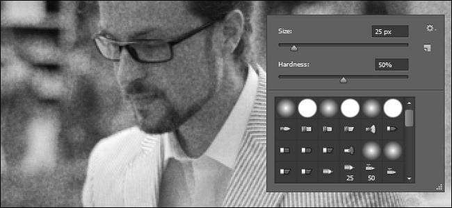 Dengan pemikiran tersebut, kita dapat memilih layer Grain Overlay (biarkan layer Micro Grain saja) dan kemudian menggunakan Eraser tool yang disesuaikan dengan kekerasan 50% dan opacity sekitar 50% untuk memudarkan grain dengan sangat ringan dan hemat di titik-titik paling terang dari foto. Tujuan kami bukan untuk menghilangkan butiran tetapi membuatnya kurang menonjol.