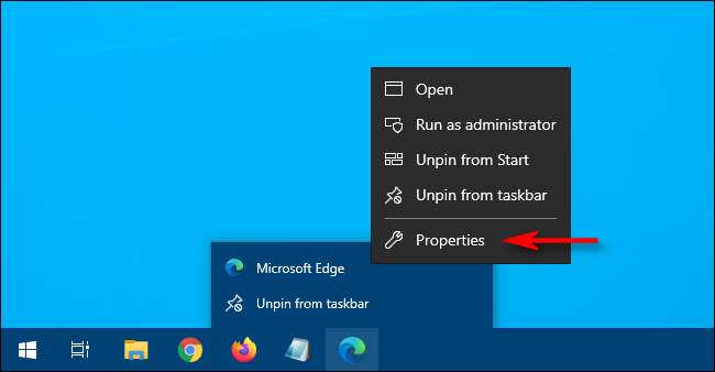 Pertama, temukan pintasan yang Anda gunakan untuk meluncurkan Edge. Ini mungkin di Start Menu, Desktop, atau di taskbar Anda. Kami perlu mengubah propertinya. Misalnya, jika Anda memiliki ikon Edge yang disematkan ke bilah tugas Anda, klik kanan padanya. Saat menu muncul, klik kanan pada kata "Microsoft Edge", lalu pilih "Properties".