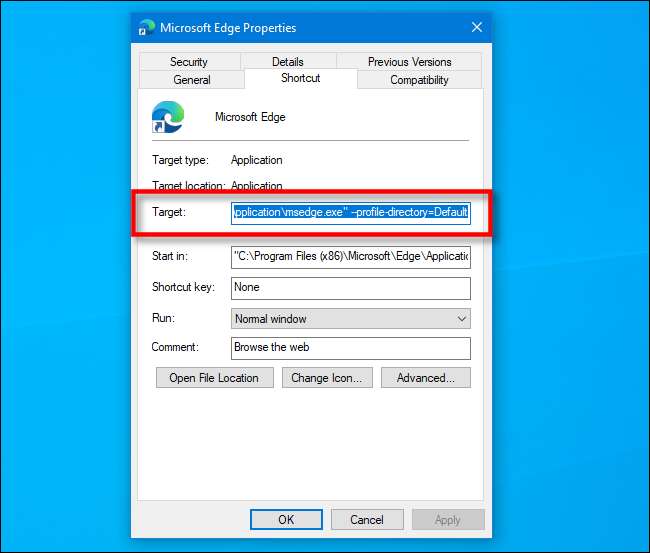 Jika Anda ingin Edge selalu diluncurkan dalam mode normal lagi, Anda dapat membuka pintasan dan menghapus opsi "-inprivate" di jalur "Target", atau cukup hapus pintasan dan buat yang baru.