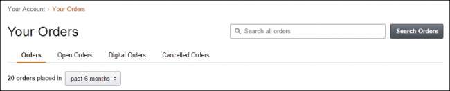 Di bagian atas layar "Pesanan Anda", Anda akan melihat empat kategori, dan Anda dapat memilih jangka waktu di mana Anda melihat pesanan sebelumnya. Apa pun yang lebih dari enam bulan dapat dilihat menurut tahun.