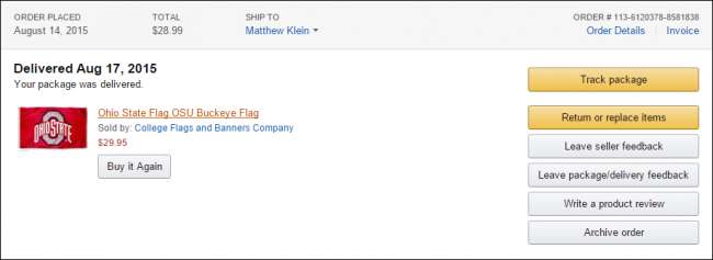 Setiap pesanan dalam riwayat Anda harus memiliki hingga tujuh opsi, termasuk kemampuan untuk membelinya kembali dengan cepat. Di sepanjang baris atas Anda dapat melihat kapan Anda memesan, berapa biayanya, kepada siapa itu dikirim, detail pesanan, atau menarik faktur.