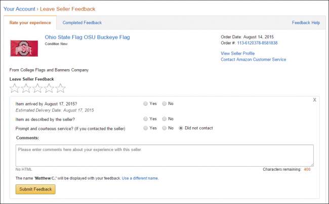 Jika Anda membutuhkan atau ingin memberikan umpan balik kepada penjual, Anda dapat melakukannya di halaman "Tinggalkan Umpan Balik Penjual". Anda dapat memberi penjual peringkat bintang dan mengungkapkan pemikiran Anda di komentar.