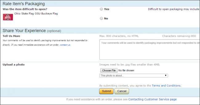 Pada catatan itu, jika Anda merasa kemasannya terlalu sulit dibuka, Anda dapat memberi tahu Amazon, serta membagikan umpan balik dengan komentar, dan bahkan mengunggah gambar untuk mengilustrasikan suatu poin.