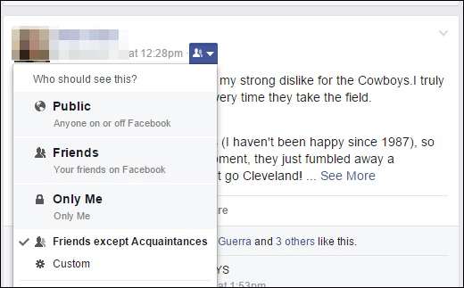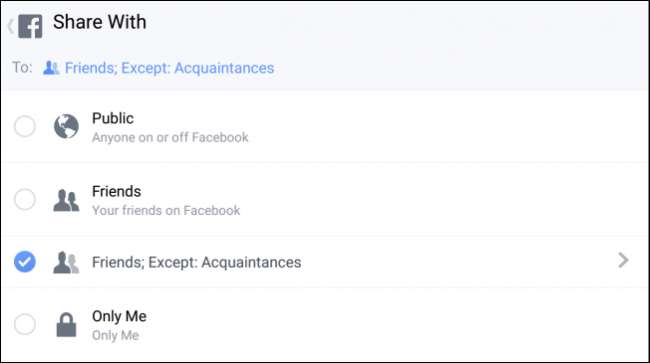 Seperti yang kami katakan, jika membatalkan pertemanan bukanlah suatu pilihan, selalu ada menempatkan orang ke dalam kelompok seperti kenalan. Kemudian, setiap kali Anda memposting sesuatu, Anda dapat memilih apakah semua orang melihatnya, atau hanya teman Anda kecuali kenalan, atau daftar yang lebih eksklusif seperti teman dekat.