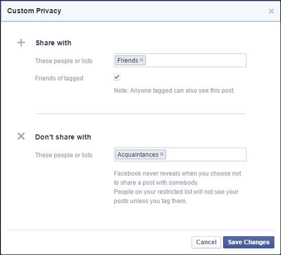 Anda bahkan dapat memilih opsi "Kustom" dan memutuskan dengan siapa atau siapa yang tidak akan berbagi pos pada tingkat yang lebih detail. Pada contoh berikut, kita dapat menambahkan grup atau individu ke kotak "jangan berbagi dengan".