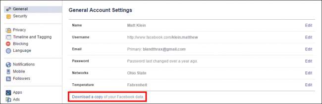 Untuk mengunduh data Facebook Anda, pertama-tama masuk ke pengaturan akun seperti yang dijelaskan sebelumnya dan dari "Pengaturan Akun Umum" klik tautan di bagian paling bawah yang bertuliskan "unduh salinan data Facebook Anda".