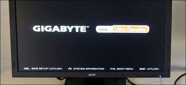 Biasanya Anda melakukan ini dengan menekan F1, F2, F11, F12, Hapus, atau tombol sekunder lainnya dengan cepat pada keyboard saat boot. (Di keyboard Gigabyte kami, perintahnya adalah "Hapus", di bagian kiri bawah layar di atas.) Jika Anda tidak mendapatkannya pada percobaan pertama, cukup matikan komputer dan coba lagi.