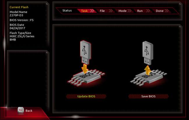 Sekali lagi, untuk setiap pabrikan, proses ini sedikit berbeda, tetapi kurang lebih semuanya harus memiliki cara untuk memperbarui program UEFI tanpa sistem operasi yang diinstal. Dalam kasus motherboard Gigabyte kami, prosesnya berjalan seperti ini: