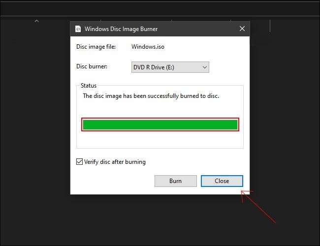 Ketika semuanya dilakukan, bilah status akan berubah sepenuhnya hijau, dan status akan membaca "Gambar disk telah berhasil dibakar ke disk." Klik "Tutup."