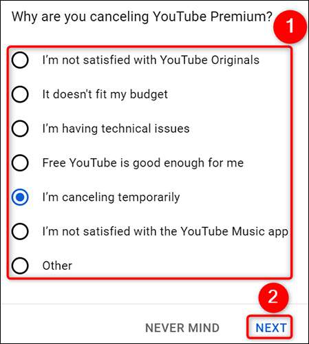 YouTube sekarang akan menanyakan alasan Anda membatalkan langganan Anda. Pilih alasan dan kemudian klik "Selanjutnya."