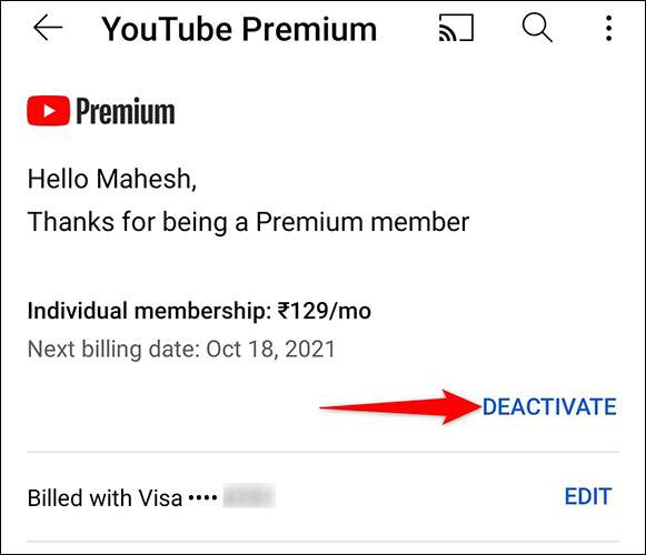 Di halaman "YouTube Premium" yang terbuka, ketuk "Nonaktifkan."