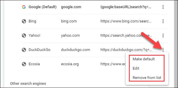 Klik ikon tiga dot untuk "Buat default," "Edit," atau hapus mesin pencari dari daftar.