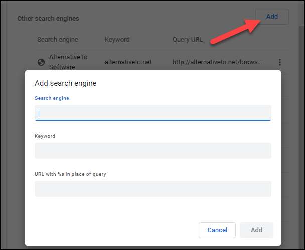 Pilih tombol "Tambah" untuk memasukkan mesin pencari yang tidak ditemukan di daftar.