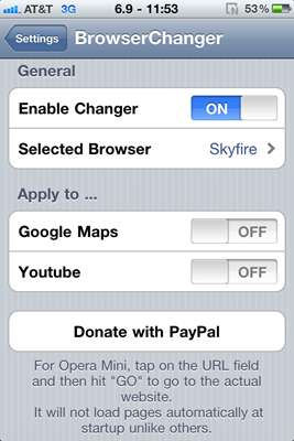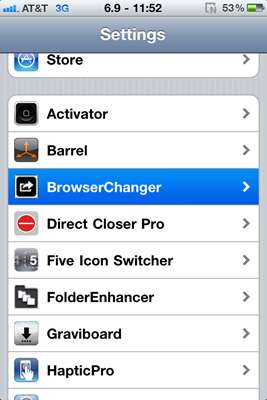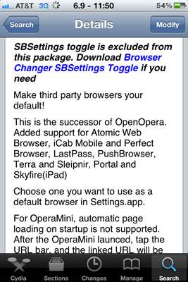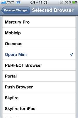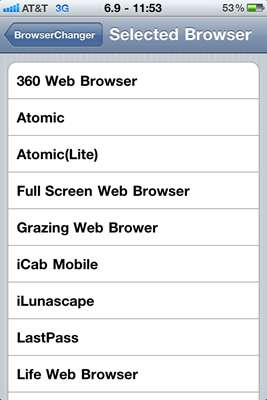 Ada daftar yang cukup besar yang mencakup sebagian besar alternatif selain Safari. Satu kekurangannya adalah Browser Changer belum diperbarui untuk bekerja dengan sempurna dengan versi baru Opera Mini dulu, tetapi yang lainnya - seperti Skyfire, Atomic, Oceanus, dan Portal - semuanya bekerja dengan baik.