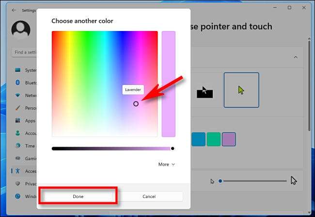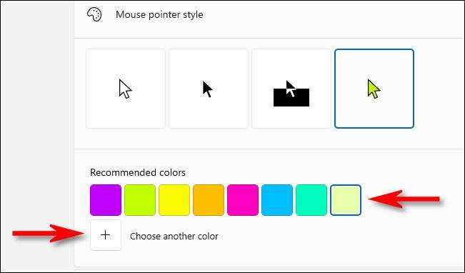 Setelah Anda memilih "Kustom," Anda dapat memilih warna pointer mouse dari salah satu dari delapan "warna yang disarankan" yang ditampilkan dalam deretan kotak di bawah ini, atau Anda dapat mengklik tombol PLUS ("+") berlabel "Pilih warna lain" untuk memilih warna khusus.