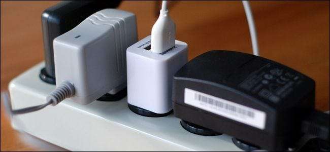 Solusi yang jauh lebih elegan yang mengurangi kekacauan, mengurangi kebutuhan stopkontak Anda ke satu outlet, dan lebih hemat energi, adalah dengan menggunakan stasiun pengisian USB (digambarkan di bagian atas artikel ini). Dengan stasiun pengisian daya, Anda menggunakan satu stopkontak untuk satu transformator yang pada gilirannya memberikan daya ke empat atau lebih port USB.