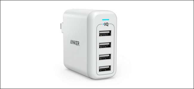 Port Daya Anker 4 ($ 24) menawarkan faktor bentuk pengisi daya dinding dengan dua port lebih sedikit dari rekomendasi kami sebelumnya, tetapi sirkuit yang sama menawarkan pengisian cerdas hingga 2,4A pada keempat port dan kualitas tinggi keseluruhan yang sama. Seperti Power Port 6 yang lebih besar, ia memiliki ulasan yang sangat bagus (700+ ulasan dengan rata-rata 5 bintang).