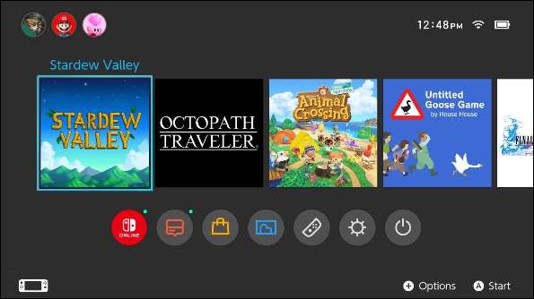 Pertama, Anda harus menghidupkan sakelar Nintendo Anda dan pergi ke layar beranda. Ini adalah layar yang menampilkan game Anda berturut-turut, dengan beberapa opsi sistem dan online yang tercantum di bawah ini.
