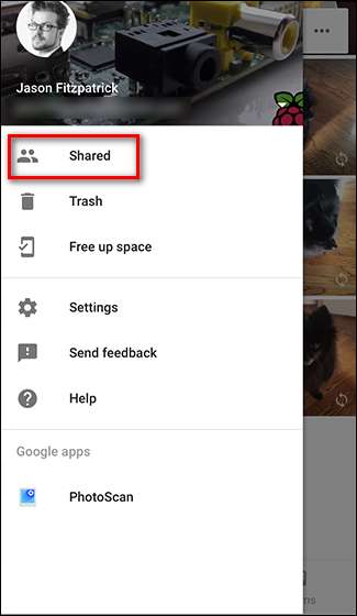 Untuk membuat album bersama pertama Anda, jalankan aplikasi Google Foto Anda dan klik ikon menu (tiga garis horizontal) di bilah pencarian. Di menu, klik "Dibagikan" untuk mengakses direktori album bersama Anda.