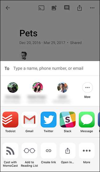 Beri nama album baru Anda, lalu klik "Bagikan". Anda akan melihat semua jenis opsi berbagi, bergantung pada aplikasi apa yang Anda aktifkan untuk berbagi. Anda dapat membagikan album dengan kontak individu, mengirim URL bersama ke aplikasi perpesanan pilihan Anda, mengirimkan tautan ke album melalui email, dan sebagainya.