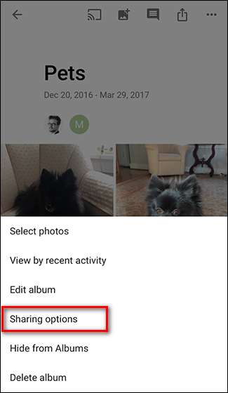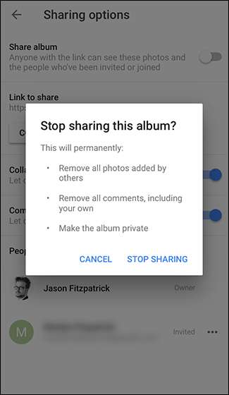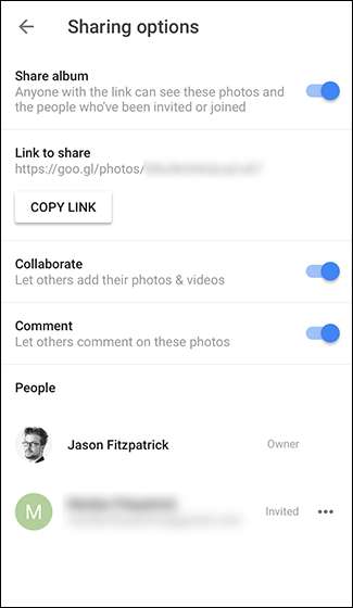 Halaman "Opsi berbagi" menawarkan beberapa opsi tambahan. Anda dapat mengambil salinan tautan berbagi, melihat siapa yang diundang untuk melihat album, mengaktifkan atau menonaktifkan kolaborasi dan berkomentar, dan — tentu saja — berhenti membagikan album.