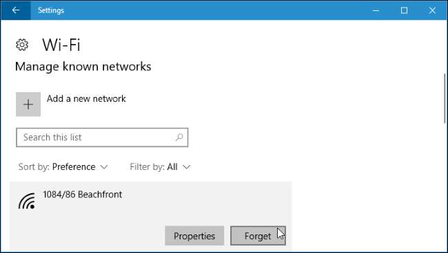Untuk melupakan jaringan Wi-Fi tersimpan yang tidak ada di sekitar, Anda harus meninggalkan Panel Kontrol lama dan menggunakan aplikasi Setelan baru. Fungsi "Kelola Jaringan Nirkabel" tidak lagi tersedia di Jaringan dan Pusat Berbagi.