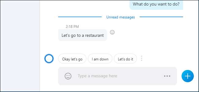 Versi terbaru Skype menyertakan tanggapan yang disarankan dari Cortana. Ini secara otomatis menghasilkan balasan untuk jenis pesan umum, yang dapat Anda kirim dengan satu klik atau ketuk. Mereka mirip dengan balasan cerdas di Gmail .