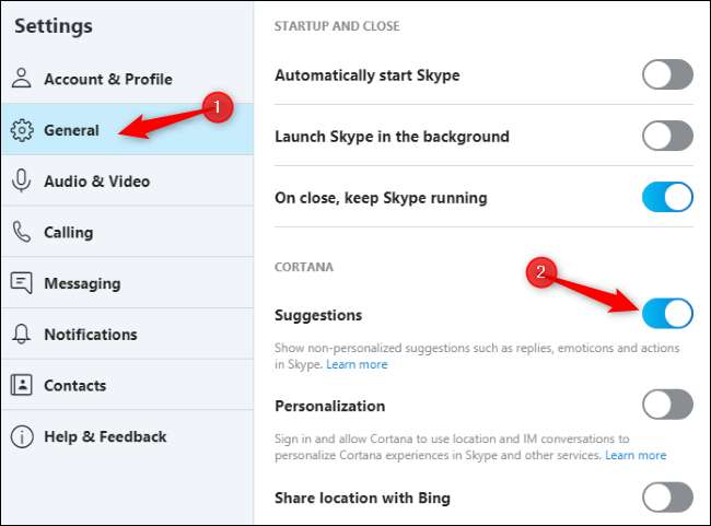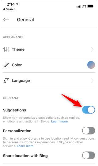 Di aplikasi Skype, ketuk ikon profil Anda lalu ketuk ikon roda gigi untuk membuka layar Pengaturan. Ketuk opsi "Umum" dan kemudian nonaktifkan fitur "Saran" di bawah Cortana.