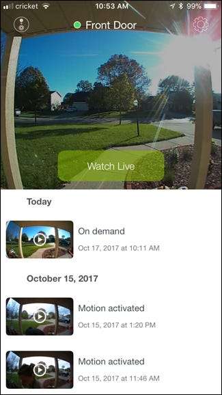 Buka aplikasi SkyBell HD di ponsel Anda dan Anda akan melihat layar utama dengan riwayat rekaman video Anda di bagian bawah.