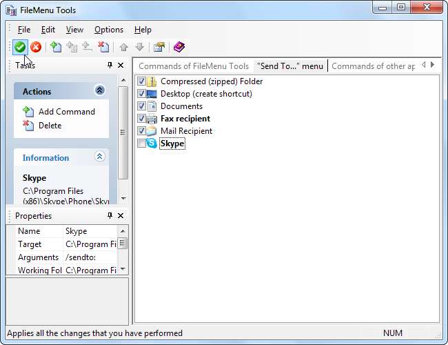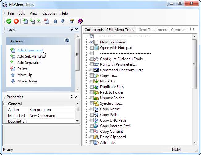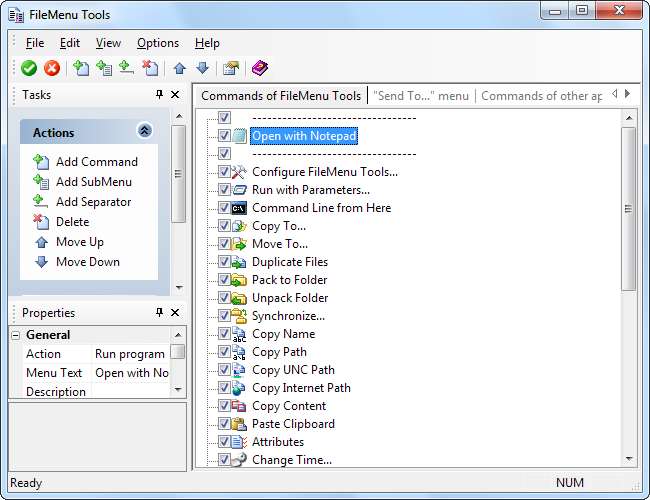 Ada tiga tab di jendela Alat FileMenu. Satu memungkinkan Anda mengelola item menu konteks yang disertakan dengan Alat FileMenu dan membuatnya sendiri, satu berurusan dengan menu Kirim Ke, dan satu lagi mengelola item menu konteks lainnya.