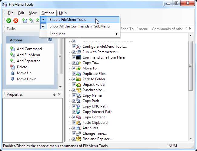 Dari tab utama, Anda dapat menonaktifkan item menu konteks individual yang disertakan dengan Alat FileMenu atau mengklik menu Opsi dan menonaktifkan semua alat yang disertakan sepenuhnya.