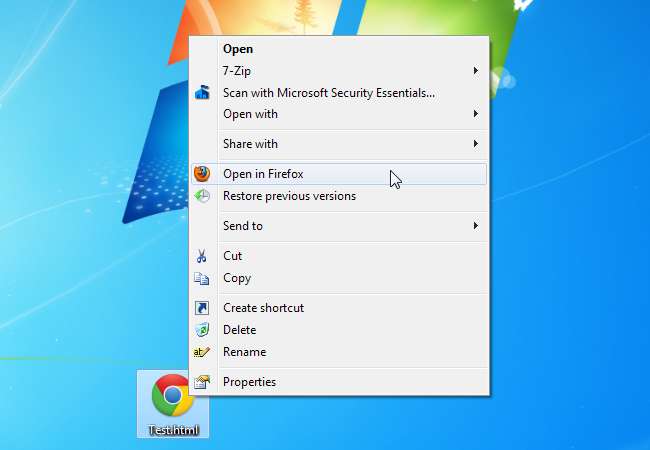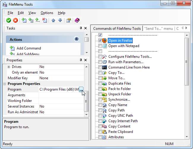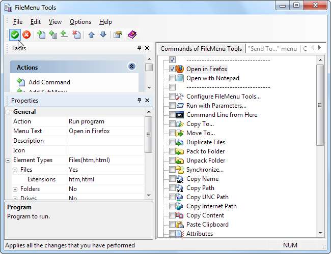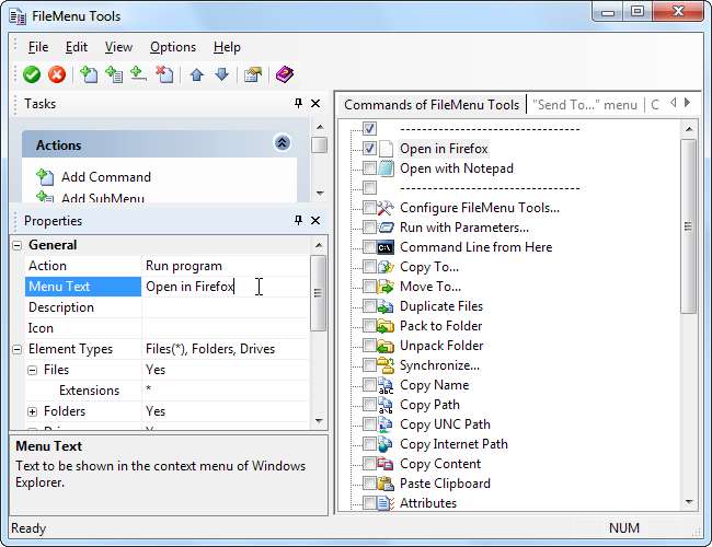 Gunakan opsi di panel Properti untuk menyesuaikan opsi baru Anda. Misalnya, kita ingin menambahkan opsi "Buka di Firefox" untuk file HTML. Pertama, kami akan menyetel opsi Teks Menu ke nama yang kami inginkan - "Buka di Firefox", dalam kasus ini.