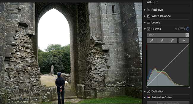 Anda mulai di tab Sesuaikan, di mana Anda akan melihat berbagai alat untuk menyesuaikan hal-hal seperti cahaya dan keseimbangan warna, dan untuk menghilangkan mata merah. Semua alatnya mudah dipelajari, jadi mainkan. Anda selalu dapat mengeklik tombol "Kembalikan ke Aslinya" di kanan atas jika Anda tidak menyukai hasil akhirnya.