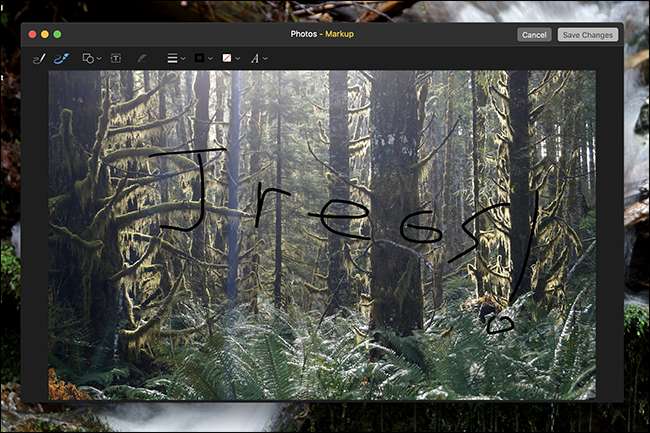 Anda mungkin bertanya-tanya di mana alat pengeditan gambar dasar, seperti pensil atau kemampuan untuk menambahkan teks, bersembunyi. Ternyata mode pengeditan menawarkan Markup, dan berhasil seperti yang bekerja di Pratinjau . Tapi itu agak tersembunyi.