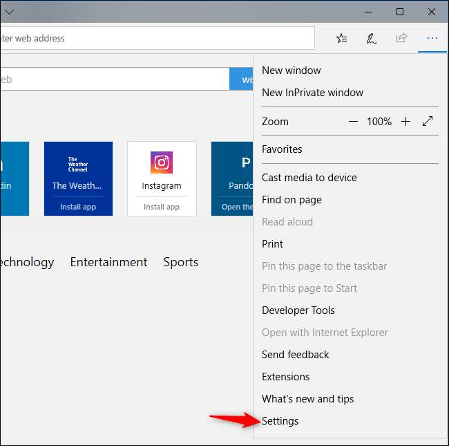 Untuk mengaktifkan mode gelap di Edge versi asli untuk Windows 10, klik tombol menu, lalu pilih perintah "Pengaturan".