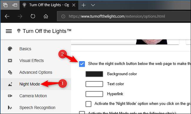 Beralih ke tab "Mode Malam", lalu pilih opsi "Tampilkan tombol sakelar malam di bawah halaman web untuk membuat halaman gelap atau terang" di sebelah kanan. Ekstensi menempatkan tombol di setiap halaman web yang akan memasukkannya ke Mode Malam.