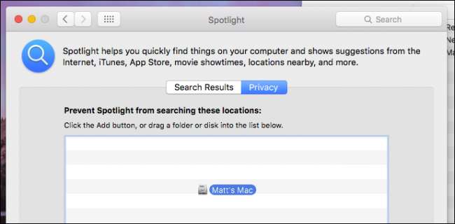 Di preferensi Spotlight, klik tab "Privasi". Anda mungkin sudah memiliki item di sini, tetapi seperti yang Anda lihat di screenshot berikut, milik kami kosong. Sekarang, seret hard drive Anda ke jendela Privasi.