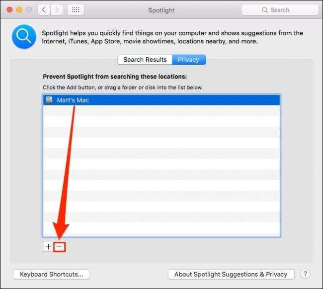Sekarang setelah drive sistem Anda ditambahkan ke jendela Privasi Spotlight, itu tidak akan diizinkan untuk menampilkan hasil darinya dan harus menghapusnya dari indeks. Hal berikutnya yang perlu Anda lakukan adalah mengklik "-" di bagian bawah tab Privasi.
