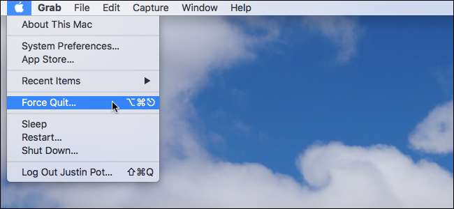 Cara termudah untuk menutup aplikasi adalah dengan menggunakan alat Force Quit, yang dapat Anda temukan di bawah logo Apple di bilah menu. (Anda juga dapat membuka jendela ini dengan menekan Command + Option + Esc, seperti versi Mac dari Ctrl + Alt + Delete .)