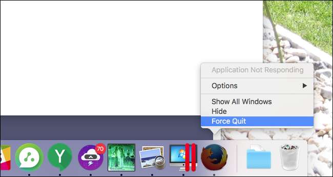 Saat aplikasi tidak merespons, Anda juga dapat memaksa keluar menggunakan Dock. Cukup klik kanan ikon dan Anda akan melihat bahwa "Force Quit" telah menggantikan "Quit".