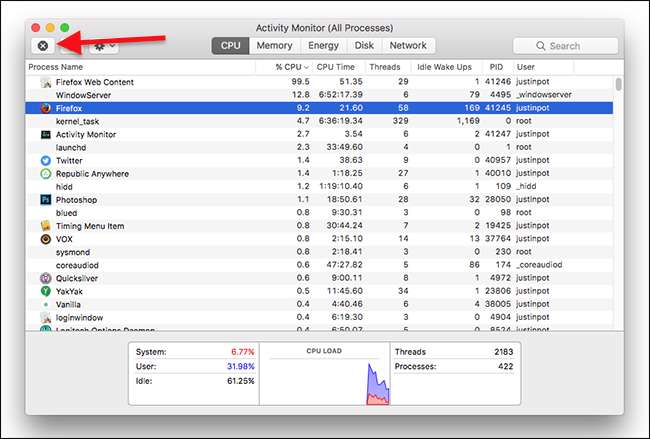 Untuk memaksa keluar dari aplikasi menggunakan Monitor Aktivitas, pertama-tama pilih aplikasi itu dalam daftar. Selanjutnya, klik tombol "X" di kiri atas.