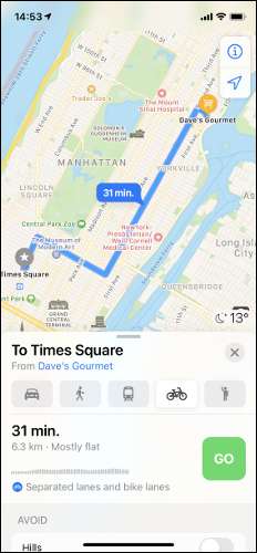 Dari sini Anda dapat memilih moda transportasi Anda dengan mengetuk ikon yang sesuai, dalam hal ini sepeda. Jika instruksi bersepeda didukung di wilayah Anda, Anda akan melihatnya terdaftar dengan perkiraan durasi perjalanan Anda, jarak total, dan visualisasi ketinggian rute.