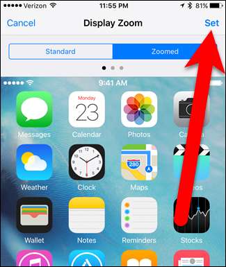 Munculan konfirmasi ditampilkan dengan pesan bahwa mengubah tampilan zoom akan memulai ulang iPhone Anda. Ketuk "Gunakan Zoomed" di bagian bawah layar untuk menggunakan tampilan yang diperbesar.