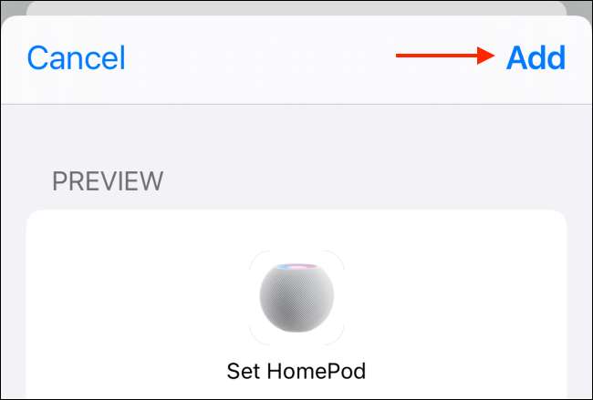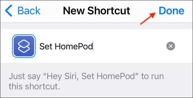 Berikan pintasan nama yang dapat dikenali (kami menggunakan "set homepod.") Dan ketuk tombol "Selesai".