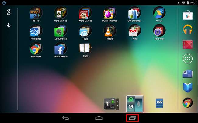 Untuk memulai, Anda harus menghapus Messenger dari daftar aplikasi terbaru jika Anda menjalankannya baru-baru ini. Sentuh tombol "Aplikasi Terbaru" di perangkat Android Anda, seperti yang ditunjukkan dengan garis merah pada gambar di bawah.